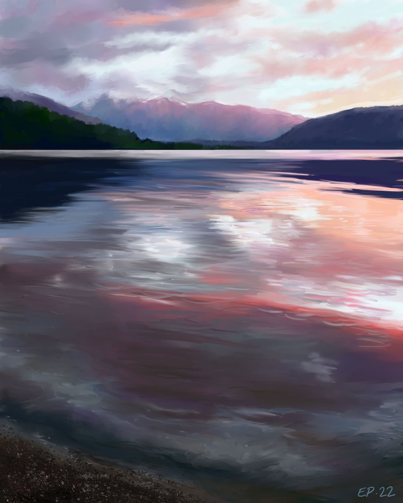 The layers of blue paint turned out to be thicker than I had anticipated, so when I peeled off the tape, a sharp edge was left behind in the sky. If you turn the painting to the side, or if the light catches it a certain way, there is obvious “shelf” on the surface of the painting. Woops!