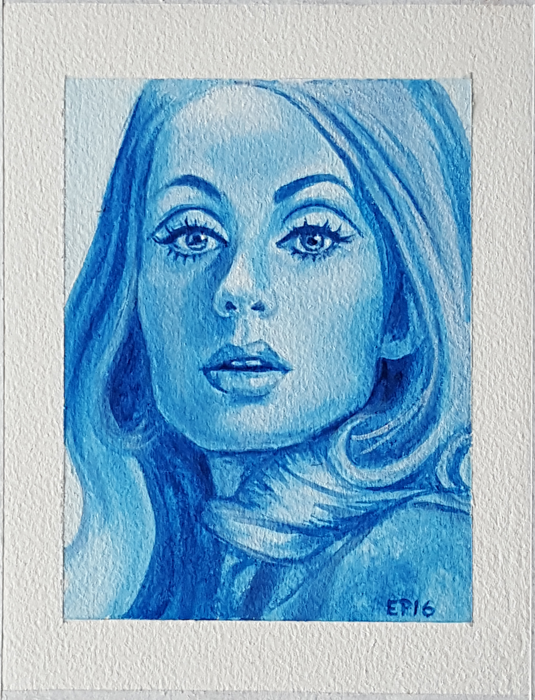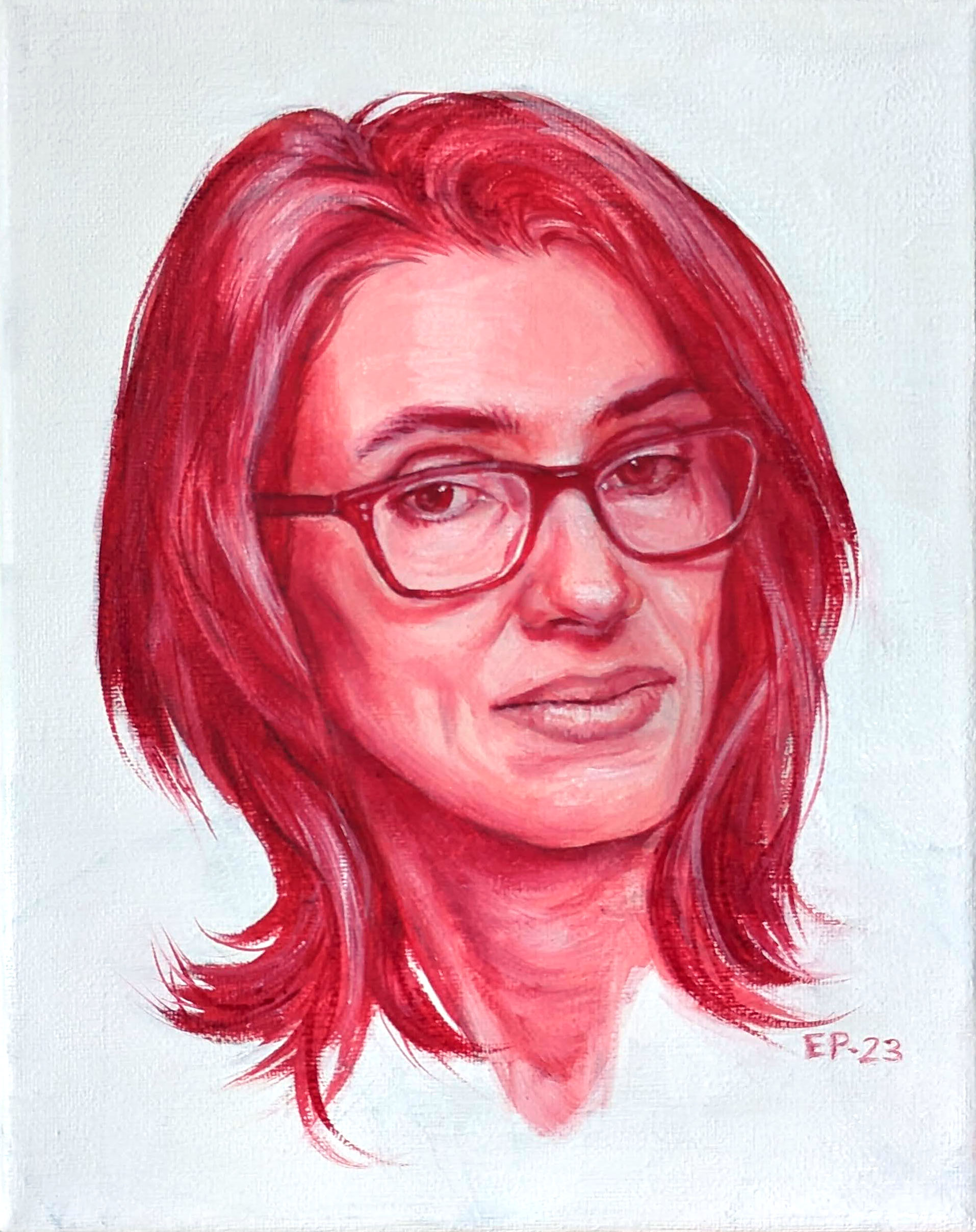 Anyways, I felt compelled to put some paint to canvas, and let me assure you that diving back into traditional art-making was a painful experience. My first painting was larger with a full selection of colours, but it had to be temporarily set aside because I realized that I had bitten off more than I could chew. This smaller, monochromatic self-portrait is actually my “rebound” painting. Still, whenever I lost control of my brush, I did, in fact, automatically move my hand in the general direction of the “Undo” button like I was still sitting in front of my keyboard (busted!).