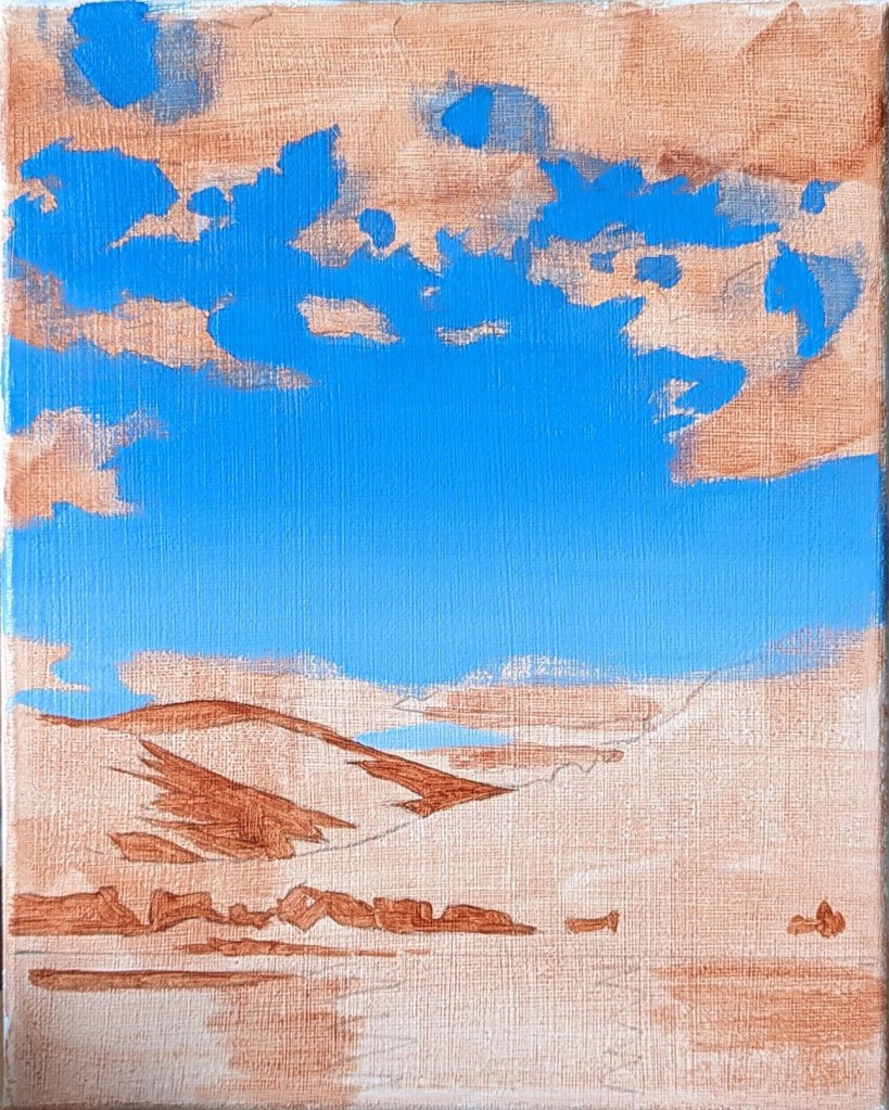 Unlike the previous landscape paintings, I did not opt for a brightly coloured ground this time around. My intention was for the acrylics to be their best acrylic selves and show off some bold colour, and I felt that fighting against a vivid ground would be overkill. Instead, I started with a light wash of Raw Sienna, and blocked in a few of the darkest areas of the painting.