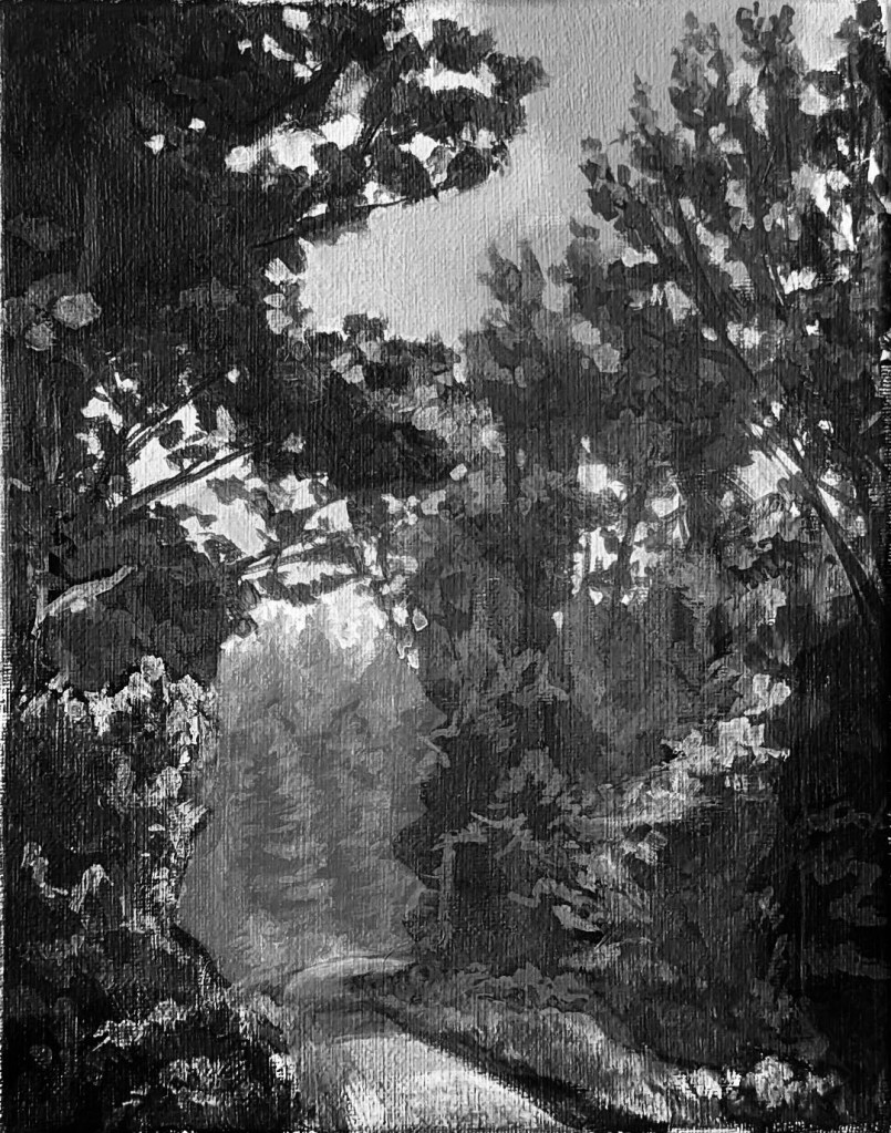 Far from being a “walk in the park” (sorry – had to!), this painting went through a LOT of reconstructive surgery. Stepping back to take in my finished piece, it became obvious to me that I had hewn too closely to my photo reference. The end result was a painting with values that worked against me, making the trees off in the distance appear to be on the same level as the trees that were in the foreground.
